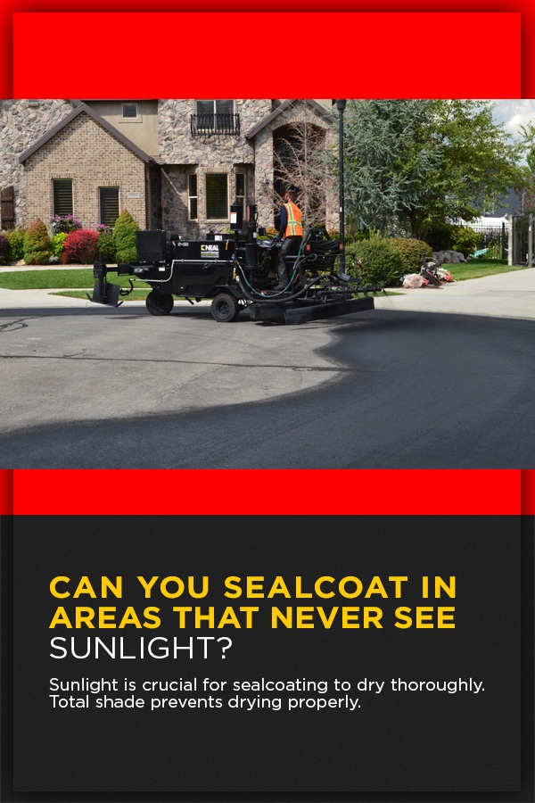 Warmth and sunshine are crucial for a sealcoat material to dry fully and properly. Total shade prevents drying. Furthermore, areas that never see any sunshine tend to have cooler surface temperatures.