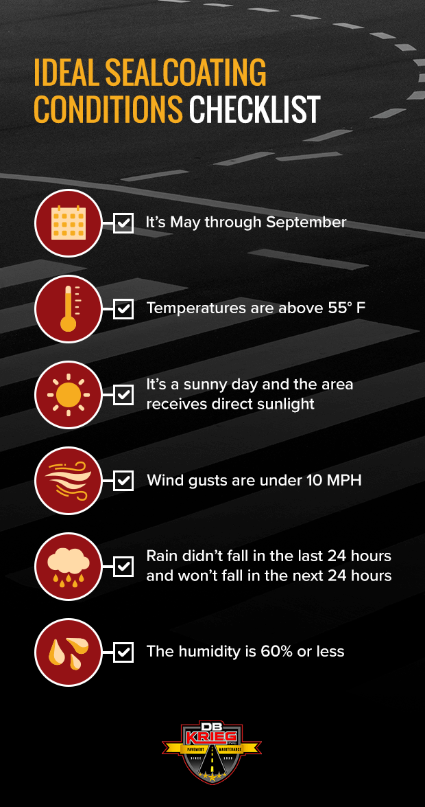 In the Northeast region, the best time of year for sealcoating is late spring and summer (typically May through September.) This is because sealcoating pavement depends on two main factors: temperatures and rainfall. The best time of year to sealcoat blacktop is when temperatures are very warm (70 degrees and rising), conditions are sunny, and humidity is low. All these conditions may not combine perfectly when you need your asphalt sealcoated, but trying to find a day that at least meets dry and sunny conditions is the best weather to seal driveways. At Daniel B. Krieg, our commercial sealcoating professionals take into account what days a customer hopes to have their blacktop sealcoating project done, as well as weather conditions, in order to schedule a time for the job that has high chances of long-lasting protection.